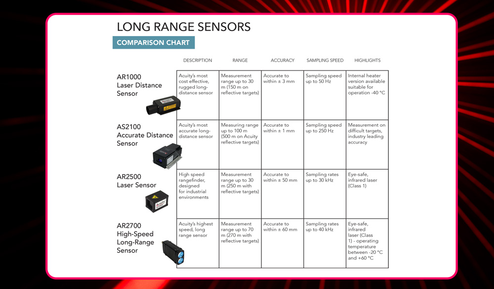 Our distance measurement sensors differentiate themselves based on ruggedness, compactness, distance range with retroreflective targets, as well as light tolerance. High-sampling rates, ability to work in industrial conditions and laser rangefinder sensors with eye-safe technology are other distinguishing features of our distance sensors. Whether your application calls for a rugged sensor, an ultra-compact sensor, or a light-tolerant sensor, Acuity’s distance measuring sensors are up for the task.